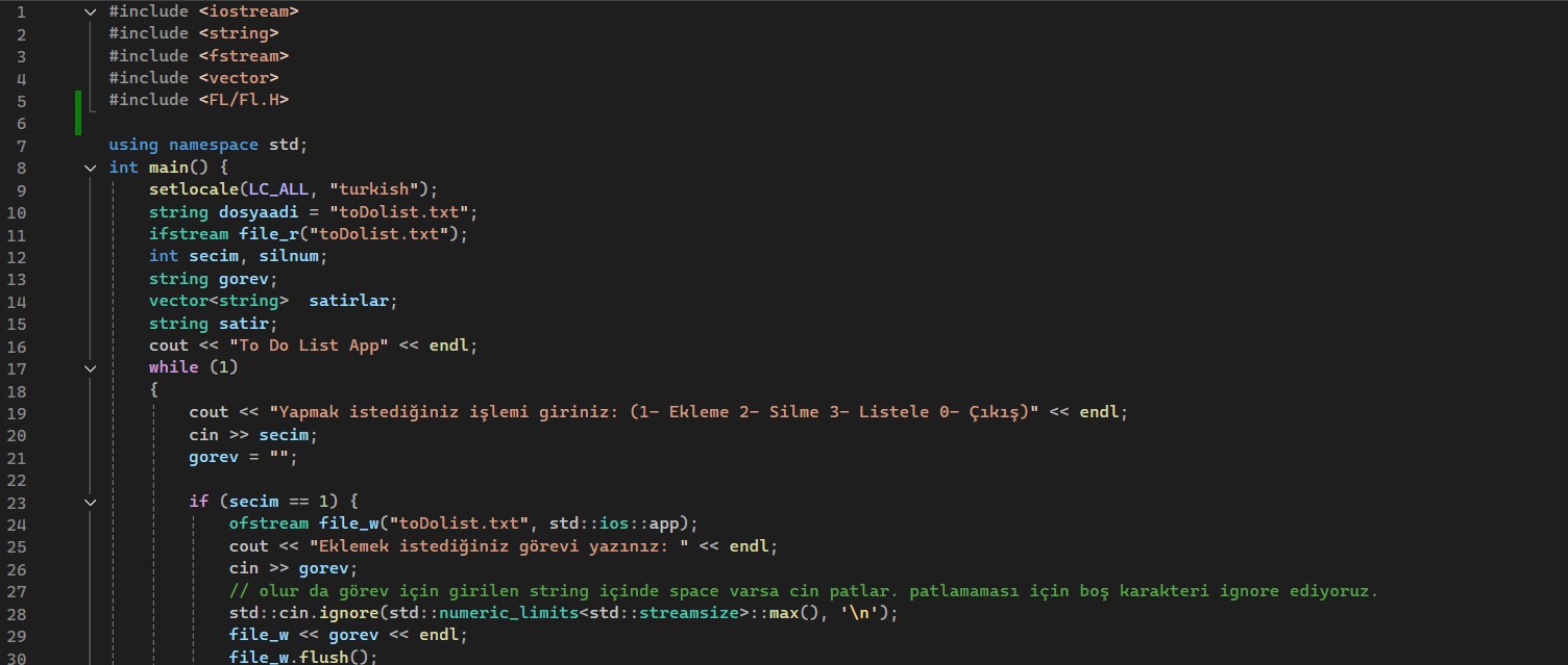 Visual Studio ortamında geliştirdiğim To-Do List projesiyle, programlama dillerinin temel yapı taşlarını uygulamalı olarak deneyimledim. Standart kütüphanelerin (<fstream>, <vector>, <string>) projeye dahil edilmesi ve etkin kullanımı konusunda pratik kazandım. Uygulama akışını yönetmek için if-else gibi karar yapılarını ve verilerin işlenmesi için for/while döngülerini karmaşık senaryolarda kullandım. Bu süreç, sadece kod yazmayı değil, aynı zamanda mantıksal bir algoritma kurma ve bu algoritmayı standart kütüphane fonksiyonlarıyla destekleme becerimi pekiştirdi.