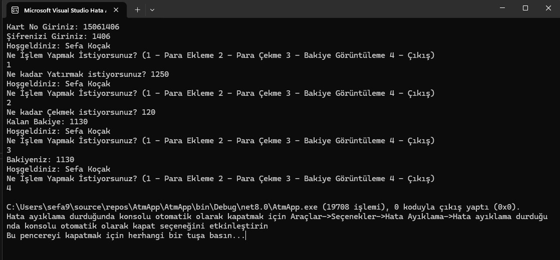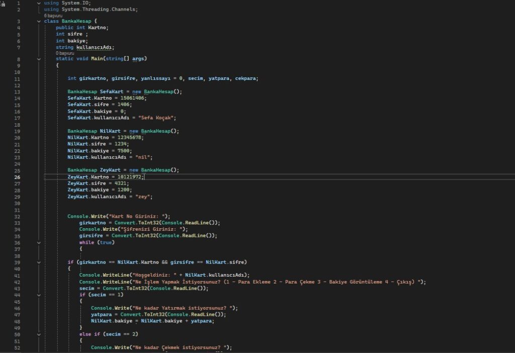 Visual Studio ortamında geliştirdiğim Banka Hesabı (ATM) projesiyle, programlama dillerinin temel yapı taşlarını uygulamalı olarak deneyimledim. Standart sistem kütüphanelerinin (System, System.IO) projeye dahil edilmesi ve sınıf (class) yapısı içerisinde etkin kullanımı konusunda pratik kazandım. Özellikle sınıflardan nesneler türeterek (instantiation) gerçek dünya verilerini dijital objeler olarak modelleme mantığını kavradım. Uygulama akışını yönetmek için if-else gibi karar yapılarını ve işlemlerin sürekliliğini sağlamak için while döngülerini kullanıcı etkileşimli senaryolarda kullandım. Bu süreç, sadece kod yazmayı değil, aynı zamanda nesne yönelimli mantıkla bir algoritma kurma ve bu algoritmayı kullanıcı girdileriyle dinamik hale getirme becerimi pekiştirdi.